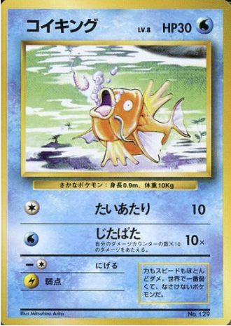 Something went wrong View cart for detailsWe have a large selection of Pokemon Singles View Magikarp 50/130 Uncommon only;Magikarp (50/130) Base Set 2 Regular price $500 USD Regular price Sale price $500 USD Unit price / per Sale Sold out Title